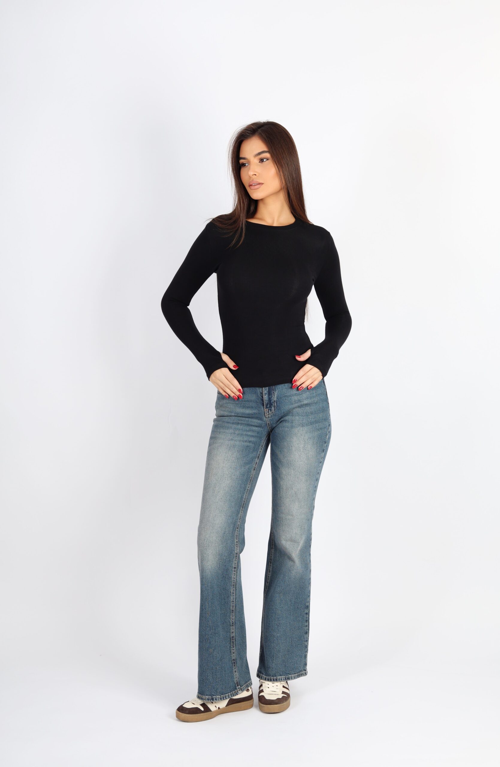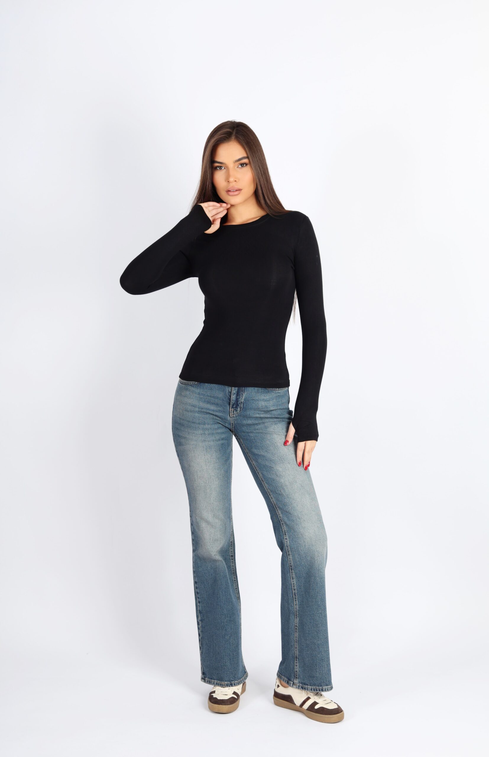 Sade ve modern tasarımıyla dikkat çeken siyah bisiklet yaka body, fit kesimi sayesinde vücudu kusursuz biçimde sarar. Parmak geçirmeli uzun kollu yapısı hem şıklık hem de konfor sunarken, günlük kombinlerinizde jean ve eteklerle kolayca uyum sağlar.