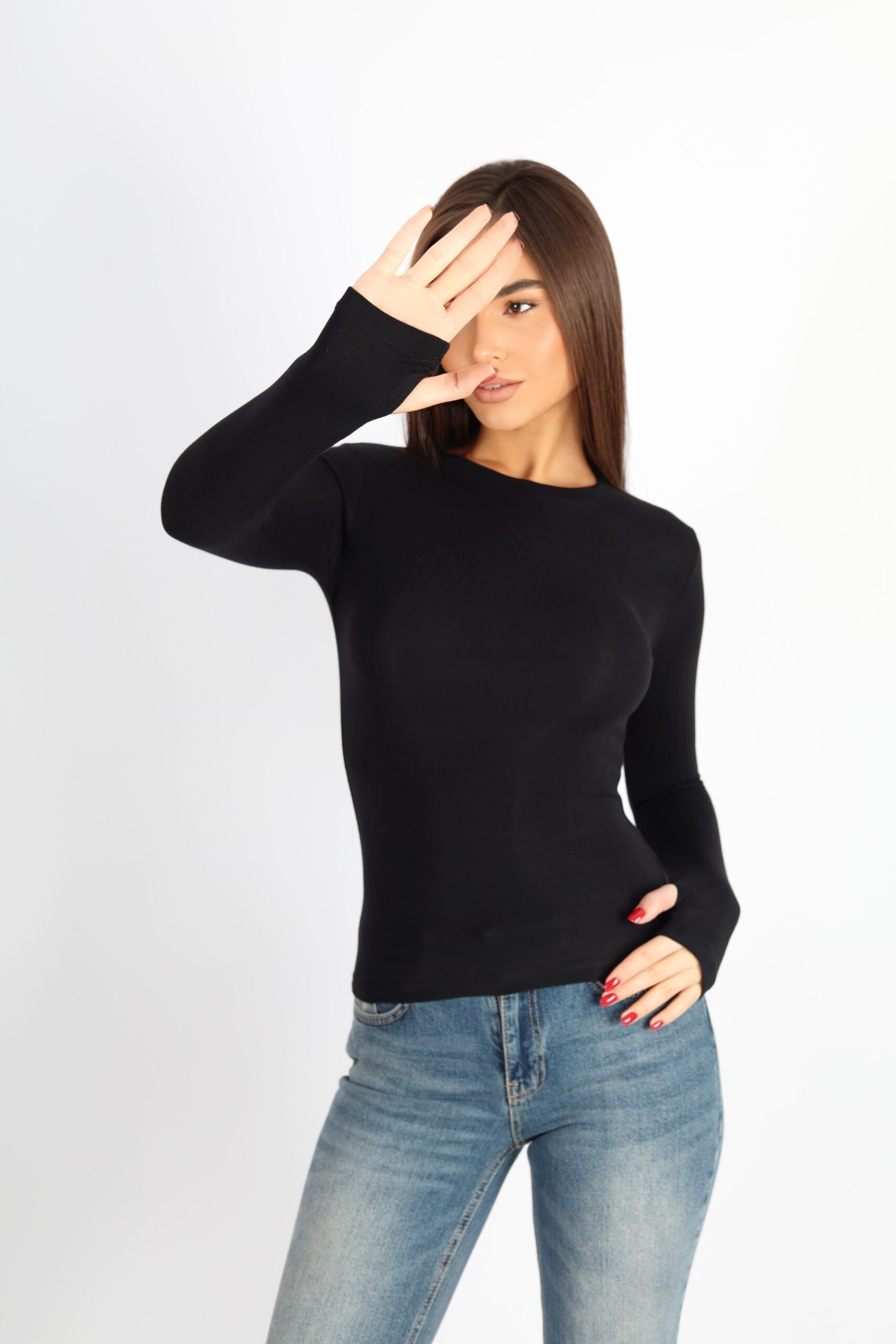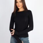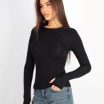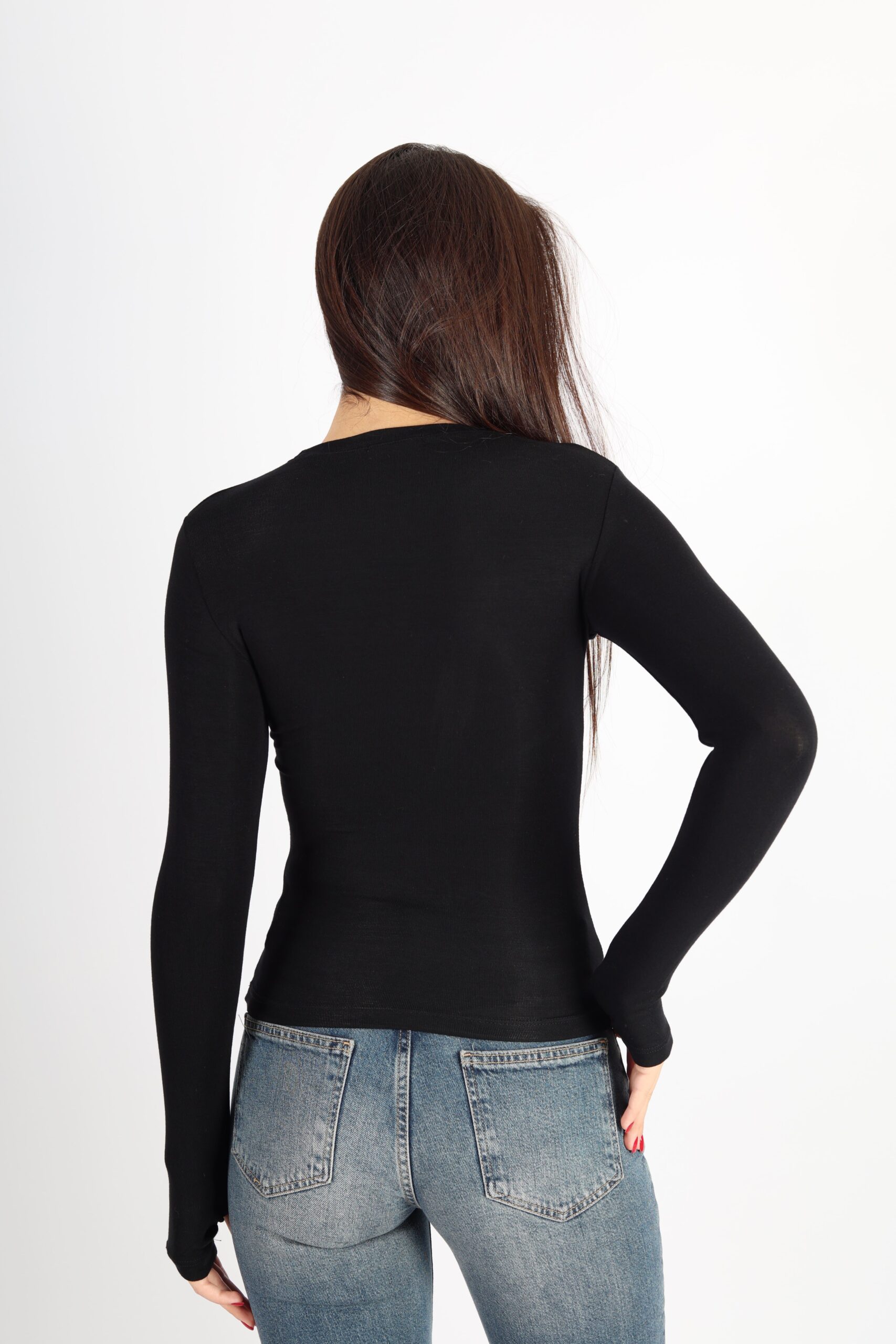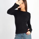 Kadın Bisiklet Yaka Basic Parmak Geçirmeli Uzun Kollu Body – Siyah